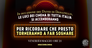 In contemporanea con la 65a edizione dei Premi David di Donatello, in diretta venerdì 8 maggio su Rai 1 dalle ore 21.25, le sale cinematografiche italiane riaccenderanno, per una sera, le insegne e gli schermi, in attesa della riapertura e di un ritorno alla normalità.