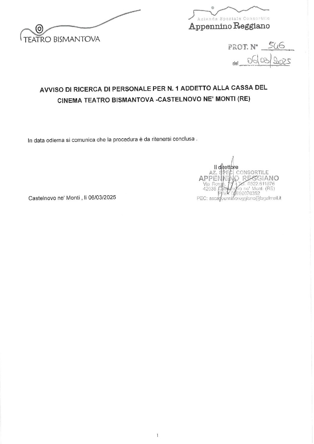 Si comunica che in merito all’avviso di ricerca di personale per n. 1 addetto alla cassa del Cinema Teatro Bismantova in data odierna (06/03/2025) la procedura è da ritenersi conclusa.