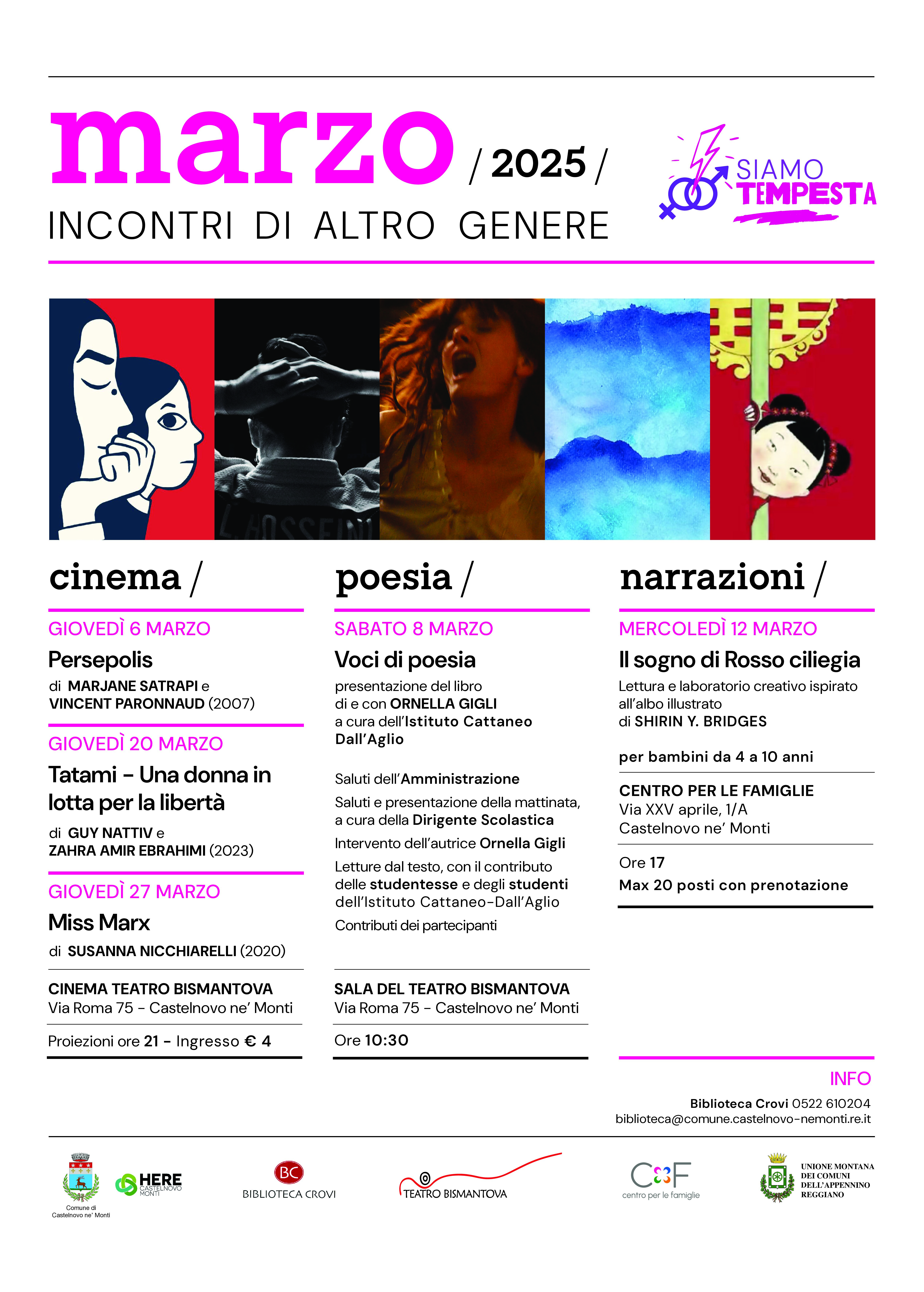 CINEMA (Cinena Teatro Bismantova – proiezione ore 21.00, ingresso €. 4,00) Giovedì 6 marzo – PERSEPOLIS di Marjane Satrapi e Vincent Paronnaud (2007) Giovedì 20 marzo – TATAMI – UNA DONNA IN LOTTA PER LA LIBERTA’ di Guy Nattiv e Zahara Amir Ebrahimi (2023) Giovedì 27 marzo – MISS MARX di Susanna Nicchiarelli (2020) POESIA (Sala del teatro Bismantova – ore […]